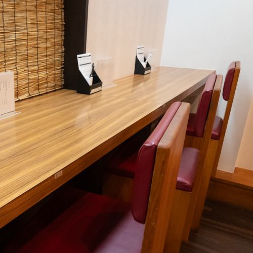 お仕事帰りのちょい飲みや、お一人様でのランチに最適なカウンター席をご用意しています。出来立ての美味しい料理を心ゆくまでお愉しみいただけます。気軽に立ち寄れる、居心地の良い空間です。
